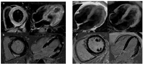In the left panel T2-STIR (a) and PSIR-TFE (b) sequences showing increased signal predominantly subepicardial patchy of the left ventricular wall due to necrosis of acute myocarditis. In the right panel sequence T1-TSE and T1-Fat Sat (c) showing multiple areas of adipose infiltration with mesocardial and subepicardial distribution of the left ventricle walls, (d) extended subepicardial signal hyperintensity in PSIR sequences for the study of “Late Gadolinium Enhancement” indicative of fibrosis for Left Dominant Arrhythmogenic Dysplasia.