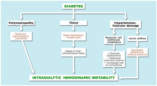 Intradialytic cardiovascular instability during HD is much more common in patients with diabetes than in those without diabetes []. This occurs for many reasons: autonomic dysfunction due to polyneuropathy, vascular damage, reduced compliance of the left ventricle and the greater interdialytic weight gain linked to thirst []. The patient with diabetes frequently has severe aortic stiffness: This may cause an increase in systolic pressure, as well as a reduction in the diastolic blood pressure. High systolic pressure increases left ventricular hypertrophy and oxygen consumption, while low diastolic blood pressure reduces coronary artery perfusion, occurring in fact during the diastolic phase []. Alterations in the sympathetic and parasympathetic system and the reduced sensitivity of the baroreceptors also increase hemodynamic instability and are other factors that contribute to worsening the outcome of these patients [,] (Figure 1).