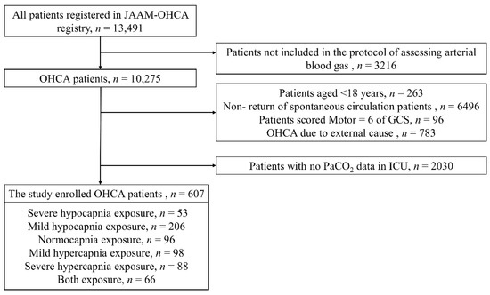 Our study inclusion criteria were as follows: patients with ROSC after OHCA aged 18 years and over, patients in the protocol of assessing arterial blood gas (ABG), and disorders of consciousness at hospital arrival (defined as Glasgow coma score (GCS) motor <6). Patients in whom the main cause of OHCA was external including trauma or hangings, and those without PaCO2 data during 24 h post-ROSC were excluded.