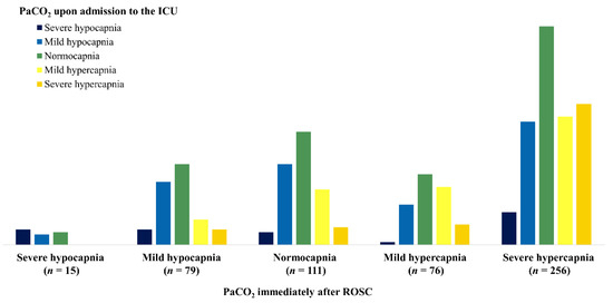 Severe hypercapnia was the most common state when measuring PaCO2 immediately after ROSC, followed by normocapnia, with severe hypocapnia being the least common (severe hypercapnia, 256; mild hypercapnia, 76; normocapnia, 111; mild hypocapnia, 79; severe hypocapnia, 15). PaCO2 upon admission to the ICU tended to show normocapnia (227 patients, 37.4%) regardless of PaCO2 immediately after ROSC. In the group that showed severe hypercapnia immediately after ROSC, severe hypercapnia was the second most common PaCO2 condition upon admission to the ICU. Similarly, patients with mild hypercapnia and mild hypocapnia in PaCO2 immediately after ROSC showed mild hypercapnia and mild hypocapnia as the second most common condition upon admission to the ICU. None of the patients who presented with severe hypocapnia immediately after ROSC had hypercapnia upon admission to the ICU.