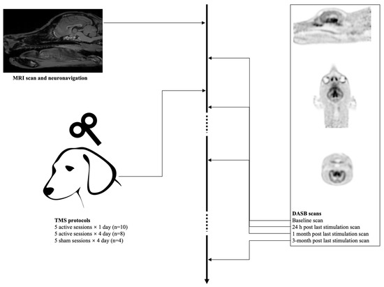 35. Dockx, R.; Baeken, C.; Duprat, R.; De Vos, F.; Saunders, J.; Polis, I.; Audenaert, K.; Peremans, K. Changes in canine cerebral perfusion after accelerated high frequency repetitive transcranial magnetic stimulation (HF-rTMS): A proof of concept study. Vet. J. 2018, 234, 66–71. [Google Scholar] [CrossRef]