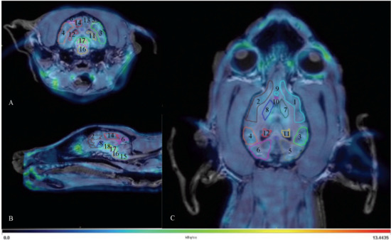 Figure 2. Transversal (A), sagittal (B), and dorsal (C) fusion image ([11C]DASB PET scan and MRI). 1: right frontal cortex, 2: left frontal cortex, 3: right temporal cortex, 4: left temporal cortex, 5: right occipital cortex, 6: left occipital cortex, 7: right caudate nucleus, 8: left caudate nucleus, 9: presubgenual anterior cingulate cortex, 10: subgenual anterior cortex, 11: right hippocampus, 12: left hippocampus; 13: right parietal cortex, 14: left parietal cortex, 15: medulla oblongata, 16: pons, 17: midbrain, 18: left thalamus.