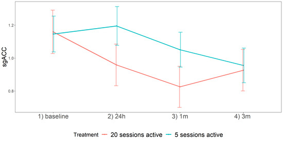 Figure 3. Line plot for sgACC for both 5-sessions and 20-sessions treatment group at each individual time moment. SEs are displayed as error bars.