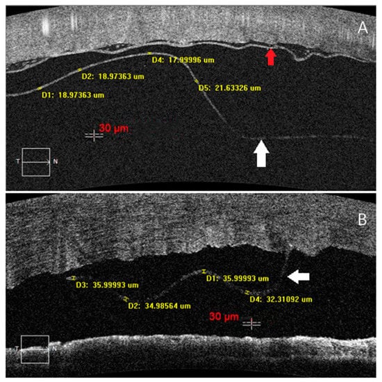 - Abou Shousha, M.; Perez, V.L.; Wang, J.; Ide, T.; Jiao, S.; Chen, Q.; Chang, V.; Buchser, N.; Dubovy, S.R.; Yoo, S.H.; et al. Use of ultra-high-resolution optical coherence tomography to detect in vivo characteristics of Descemet’s membrane in Fuchs’ dystrophy. Ophthalmology 2010, 117, 1220–1227. [Google Scholar] [CrossRef] [PubMed] [Green Version]
