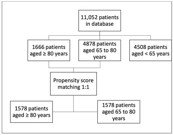 3.5. Comparison with Less-Elderly Patients (65 ≤ Age < 80 Years) after Propensity Matching