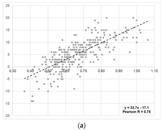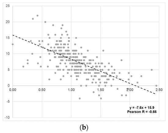 (a) Preoperative Thoracic Curve Ratio (PreTCR, X axis) vs. Preoperative T1 Tilt Angle (Y axis). (b) Thoracic Curve Correction Ratio (Percent Correction Ratio/PreTCR, X axis) vs. Postoperative T1 Tilt Angle (Y axis).