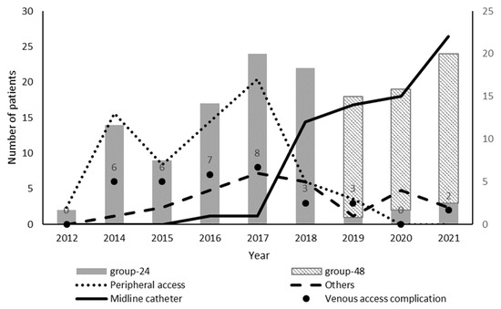 Treatment in Group 48 was not associated with higher treatment failure than Group 24 in univariate analysis (unadjusted OR, 0.59; 95% CI, 0.15–1.83; p = 0.390). In addition, after adjusting for potential confounding factors, treatment failure was not found to be different between Group 24 and Group 48 (adjusted OR (ORa), 1.38; 95% CI, 0.25–8.20; p = 0.704). None of the variables included in the multivariate analysis were significantly associated with treatment failure (Figure 2). The rate of vascular access complication was 23.3% in the groups. There was a significant increase in these complications in Group 24 (33.0%) with respect to Group 48 (7.3%) (p < 0.001). The evolution of vascular access complication over the years is shown in Figure 1. The main cause was extravasation, malfunction, or catheter loss in both groups (74.2% vs. 100%). Phlebitis occurred in 8 patients, all in Group 24.