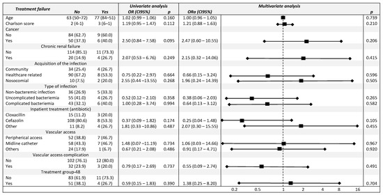 Secondly, a univariate and multivariate logistic regression model was built to determine the factors associated with treatment failure, estimating odds ratios (ORs) and 95% confidence intervals (CIs). We included all the explicative variables that are clinically relevant or that have already been identified as being associated with poor outcomes in the univariate analysis—age, Charlson score, cancer, chronic renal failure, acquisition of the infection, type of infection, inpatient treatment, vascular access, vascular access complication, and treatment group. No data were missing in the multivariate model.