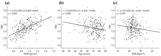 TBS was positively correlated with BMD (r = 0.572; p < 0.001; Figure 1a) and negatively correlated with age (r = −0.214; p < 0.001; Figure 1b) and BMI (r = −0.137; p = 0.023; Figure 1c). The correlation coefficient was more pronounced in women than in men in terms of BMD (r = 0.550 vs. r = 0.492) and age (r = −0.365 vs. r = −0.096), whereas the relationship between TBS and BMI was more pronounced in men (r = −0.284 vs. r = 0.026) (Supplementary Figures S1 and S2).