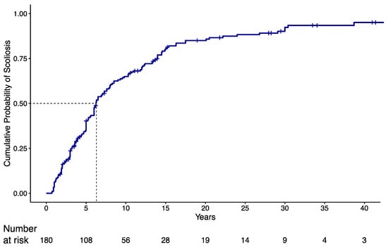 In the overall cohort, 150 patients (83.3%) developed scoliosis during a median follow-up of 33.5 years (min: 0.7 years; max 43.4 years). Median age at diagnosis of scoliosis was 6.3 years (95% C.I.: 5.6 to 7.9). Kaplan–Meier estimate of the cumulative probability of diagnosis of scoliosis in the overall cohort is shown in Figure 1, where the steepest slope is evident in the first 15 years of life. At 5 years of age, the cumulative probability was equal to 0.403 (95% CI: 0.325 to 0.472) and almost doubled (0.806; 95% CI 0.732 to 0.859) at the age of 15.