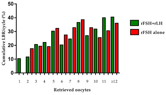Female age represents the most critical factor affecting both natural fecundity and pregnancy chance in in vitro fertilization (IVF) [1,2]. Indeed, the relevant and progressive decrease of female fertility observed in advanced reproductive ages (>35 years) is mainly due to age-related detrimental effects on oocyte quality, which ultimately affects embryo competence [3]. A higher incidence of chromosomal abnormalities in oocytes [4], together with a progressive decline in reproductive endocrine function [5], appear to be the main driving forces of fertility impairment in these patients. Based on the “two-cell, two-gonadotropin” theory, follicle stimulating hormone (FSH) and luteinizing hormone (LH) play a critical role in stimulating the two cellular components of the ovary, granulosa cells and theca cells, respectively, leading to the secretion of ovarian steroids. FSH controls the proliferation of granulosa cells and promotes estradiol (E2) synthesis, whereas LH stimulates androgen production by theca cells [6,7]. Although FSH can induce follicular growth even without LH, it has been observed that, in the absence of LH activity, the follicles undergo suboptimal development [8], not only due to the shortage of androgen substrate for aromatization, but also because of the lack of a direct LH effect [9]. Indeed, LH plays pivotal roles in: (i) follicular recruitment, increasing FSH receptor expression in granulosa cells [10]; (ii) follicular maturation, via local growth factors recruitment [11]; (iii) completion of meiosis and extrusion of the first polar body [12]; and (iv) decidualization of endometrial stromal cells promoting embryo implantation [13]. Notably, both direct LH effects and androgen production seem to be perturbed by ovarian ageing [6]. In most women undergoing controlled ovarian stimulation (COS) for medically assisted reproduction (MAR), endogenous LH sustains follicle recruitment, but women above 35 years exhibit decreased LH activity, reflecting into lower androgen and estrogen follicular fluid levels [14]. In this scenario, human recombinant LH (rLH) supplementation during COS has been suggested as more effective than high-dose rFSH alone in improving clinical pregnancy rates in women of advanced reproductive age [15,16]. However, the role of rFSH + rLH co-treatment in these women is still a matter of debate, as no consensus on the indication of LH supplementation has been reached so far [17,18,19,20]. The aim of this retrospective study was to compare the live birth rate (LBR) of expected poor, suboptimal, and normal responders (classified according to the Bologna criteria and POSEIDON classification) when COS was performed using rFSH + rLH co-treatment or rFSH alone. The respective effectiveness of the two regimens was further tested after patients’ stratification for the number of retrieved oocytes.