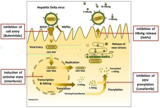 Different approaches have been investigated to interfere and suppress HDV replication during the last years. As a result, three significant therapeutic mechanisms have been identified: (1) inhibition of HDV prenylation, (2) inhibition of HBsAg release and (3) inhibition of cell entry [] (Figure 1).