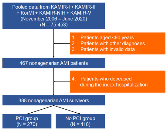 As illustrated in Figure 1, we selected 467 nonagenarian patients with AMI after excluding patients aged <90 years, those with other diagnoses than AMI, and those with invalid data. The final analysis excluded patients who died during the index hospitalization, leaving 388 nonagenarian AMI survivors. Patients were assigned to two groups depending on whether PCI was performed as follows: the PCI (n = 270) and no-PCI (n = 118) groups.