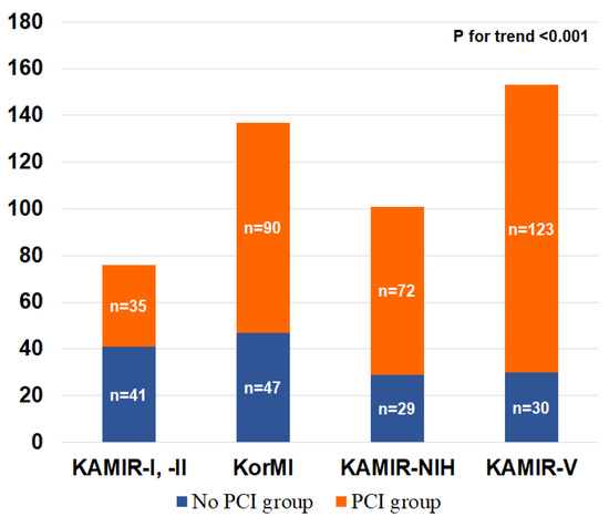 The trends in patient volume and PCI rates in Korean nonagenarian patients with AMI are illustrated in Figure 2. The overall number of nonagenarian patients with AMI gradually increased from 76 in the KAMIR-I and KAMIR-II registries to 153 in the KAMIR-V registry. The proportion of PCI gradually increased from 46.1% in the KAMIR-I and KAMIR-II registries to 80.4 % in the KAMIR-V registry.