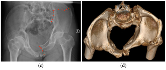 Imaging of the displaced pelvic fracture with fracture mapped by red dotted line: (a) AP view; (b) outlet view; (c) inlet view; (d) 3D reconstruction view.