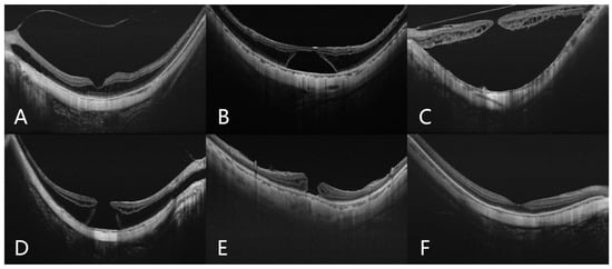 Typical SS-OCT images of highly myopic eyes with different types of MTM. (A) Foveoschisis; (B) foveal detachment; (C) macular hole retinal detachment; (D) macular hole with foveoschisis; (E) macular hole without foveoschisis; (F) no MTM.