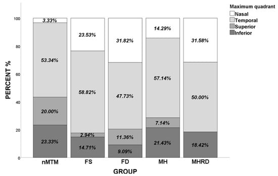 The morphological characteristics measured through SS-OCT, such as CT, ST, and MOSH, for different grades of MTM groups are shown in Table 2. Compared with the nMTM group, the MTM groups displayed a significantly thinner CT (p < 0.001), a significantly thicker ST (p = 0.013), and a significantly higher MOSH (p < 0.001) in all four quadrants. Interestingly, we found that CT and ST did not differ between the nMTM and MH groups. Additionally, CT (p < 0.001) and ST (p < 0.001) were significantly higher in the nMTM and MH groups than in the FS, FD, and MHRD groups. MOSH was found to be significantly lower in the nMTM group than in the FS, FD, and MHRD groups in all four quadrants (p < 0.001); however, no significant difference was found in MOSH among the FS, FD, and MHRD groups. Moreover, MOSH in the MH group showed a similar tendency as in the nMTM group (Table 2). The maximum MOSH was found to be significantly lower in the nMTM group than in the MTM groups (p < 0.001). Figure 3 shows the distributions of the maximum MOSH for the five study groups. The most common location of the maximum MOSH was in the temporal quadrant in all groups. The sum of the proportion of eyes with the maximum MOSH, located on the nasal and temporal side in the MTM group (79.17%), was significantly higher than in the nMTM group (56.67%) (p = 0.009).