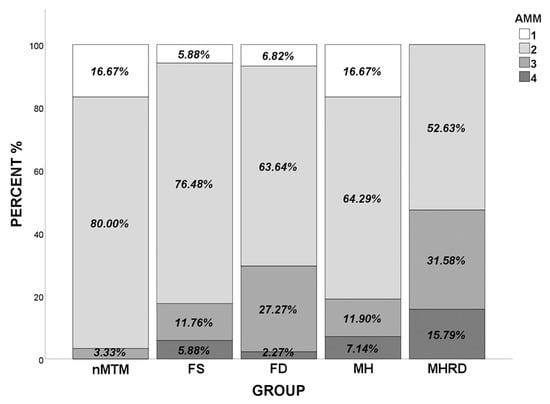 The constituent ratios for AMM differed significantly between the MTM and nMTM groups (p = 0.020). The proportion of eyes with A3 or A4 in the MTM group (28.48%) was significantly higher (p = 0.003) than in the nMTM group (3.33%). Figure 4 shows the distributions of AMM grades for the five groups. Eyes with A1 accounted for 16.67% of all eyes in the MH group; this proportion was similar to that in the nMTM group (16.67%), but significantly higher than that in the FS (5.88%) and FD (6.82%) groups (p = 0.029). No eyes with A1 were observed in the MHRD group. The prevalence of severe AMM (A3 or A4) was the highest in the MHRD group (47.37%), followed by the FD group (29.54%), MH group (19.04%), and FS group (17.64%) (p < 0.001). Compared with the MH/FS− subgroup, eyes in the MH/FS+ subgroup suffered more severe AMM (p = 0.009).