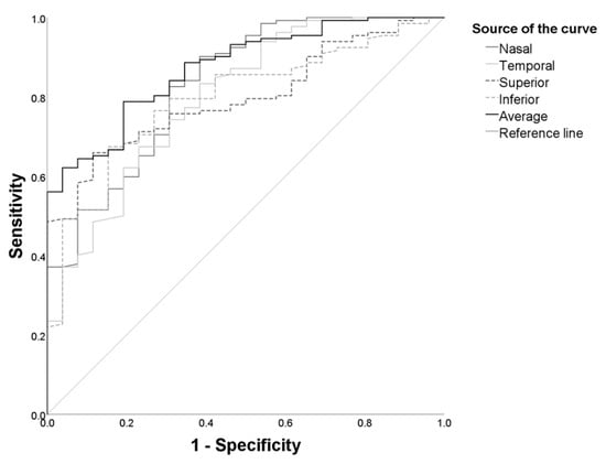 ROC analysis of different MOSH parameters. The average MOSH showed the highest AUC value. AUC: area under the curve, MOSH: macular outward scleral height, ROC: receiver operator characteristic.