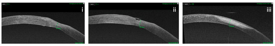 AS-OCT measures the entire corneal and epithelial thickness, analyzes corneal deposits and infiltrates, providing information as to their location and stromal depth, and enables the evaluation of the corneal flap following LASIK. It is also crucial in corneal lamellar surgery and in the study of ectatic pathologies, and a proven utility in the evaluation of pterygium, pinguecula, and scleromalacia [2,4,5,6,7,8]. Different studies have highlighted the role of AS-OCT in the management of corneal infections such as keratitis and peripheral ulcers [9,10,11,12].