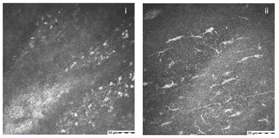 IVCM in a patient with post-herpetic NK shows no sub-basal nerve fibers at baseline (i). After 8 weeks of the treatment with rh-NGF, the presence of nerves can be detected (ii).