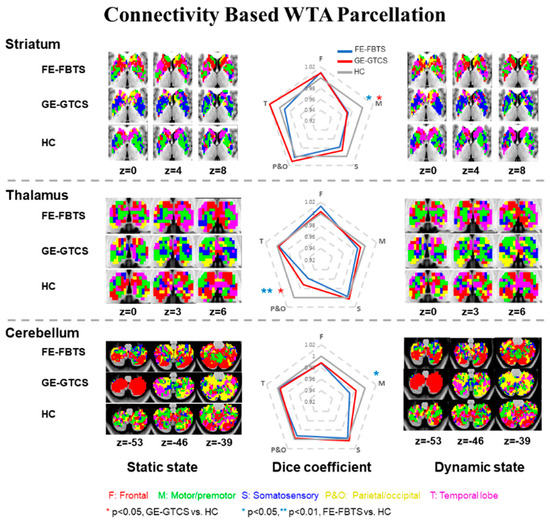 Each WTA map showed a pattern of connectivity to five cortical networks for each of the subcortical/cerebellar structures. Dice coefficient analysis revealed the high spatial similarity of WTA maps between static connectivity and dynamic connectivity. Computing the Dice coefficient between patients and controls, and GE-GTCS and FE-FBTS showed statically significant differences in motor cortex-striatum and parietal–occipital cortex-thalamus. For the cortical-cerebellum networks, FE-FBTS showed more connectivity in motor cortex-cerebellum (Figure 1; Table S1).