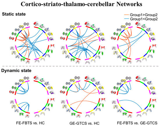 Compared to controls, FE-FBTS and GE-GTCS both show altered functional connectivity, mainly correlated with the subregions of the motor/premotor and somatosensory networks. Among these two groups, the static connectivity of the cerebellum increased, while dFC variability decreased. In a static state, the connectivities between the striatum and thalamus and cerebellum were decreased in the FE-FBTS and GE-GTCS, while connectivity between cortex and thalamus were increased in GE-GTCS and decreased in FE-FBTS.