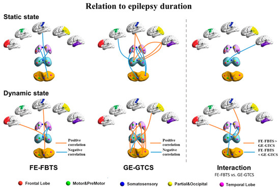 Epilepsy duration of FE-FBTS and GE-GTCS was negatively correlated with static, as well as dynamic, connectivity measures between the striatum and thalamus. Static functional connectivity between the somatosensory cortex and thalamus was negatively correlated with the epilepsy duration of FE-FBTS, while it was positively correlated with the epilepsy duration in GE-GTCS.