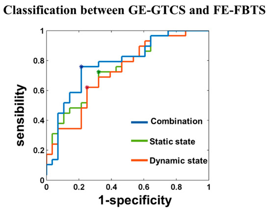 Classification showed the accuracy, sensitivity, specificity, and AUC values between GE-GTCS and FE-GTCS: 66.67%, 72.74%, 67.86%, and 0.7475 when using static measures; 68.42%, 62.07%, 75.00%, and 0.7278 when using dynamic measures; and 77.19%, 75.86%, 78.57%, and 0.7833 when combining static and dynamic functional connectivity metrics (Figure 4). The features with prominent discriminative abilities were mainly for connectivity associated with the thalamus and cerebellum (Table S4).