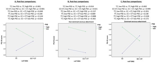 Post-hoc comparisons are reported in Figure 1. Among the rs4713902 TT homozygotes, a low level of perceived self-efficacy was associated with a significantly higher number of PLEs. The rs4713902 TT homozygotes with a low level of perceived self-efficacy had a significantly higher number of PLEs compared to the rs4713902 C allele carriers with high and low levels of perceived self-efficacy. Further stratification of the sample demonstrated that a low level of perceived self-efficacy is associated with a significantly higher number of PLEs only in subjects with the rs4713902 TT genotype and predominant anxious attachment style. Among individuals with non-dominant anxious attachment style, a low level of perceived self-efficacy was associated with a significantly higher number of PLEs, regardless of the rs4713902 genotype.