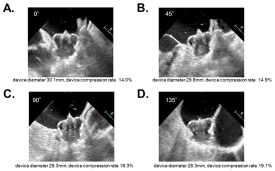 A representative case of WATCHMAN 2.5 (device size 33 mm) showing a variety of device compression rates observed by transesophageal echocardiography at 0 degrees (A), 45 degrees (B), 90 degrees (C), and 135 degrees (D).