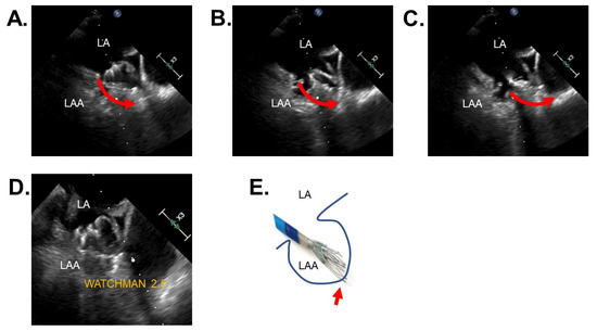 A representative case of left atrial appendage perforation and non-relevant pericardial effusion during WATCHMAN 2.5 implantation. (A) Immediately before perforation; during recapture; (B) a tip of WATCHMAN 2.5 device moved towards distal of left atrial appendage wall; (C) a tip of WATCHMAN device perforated the wall of left atrial appendage; (D) immediate closure of left atrial appendage by the device; (E) illustrations of the left atrium appendage and catheter. Red arrows indicate the direction of the catheter. A red arrow indicates the perforation site. LA, left atrium; LAA, left atrial appendage.