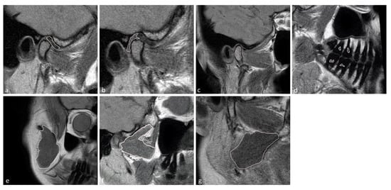 - Koca, C.G.; Gümrükçü, Z.; Bilgir, E. Does clinical findings correlate with magnetic resonance imaging (MRI) findings in patients with temporomandibular joint (TMJ) pain? A cross sectional study. Med. Oral Patol. Oral Cir. Bucal. 2020, 25, e495–e501. [Google Scholar] [CrossRef]
