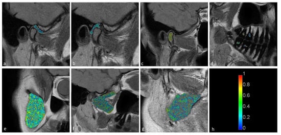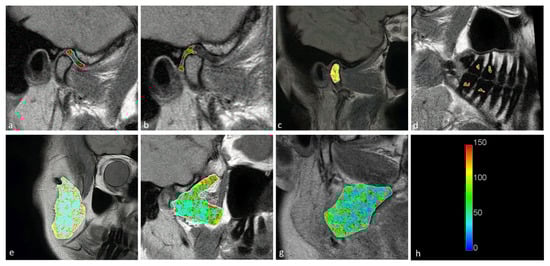 Long T2 maps obtained for the (a) disk; (b) retrodiscal tissue; (c) bone marrow of the condyloid process; (d) pulp; (e) m. masseter; (f) m. pterygoideus lateralis; and (g) m. pterygoideus medialis. (h) Color scale showing the reference T2 times in seconds.