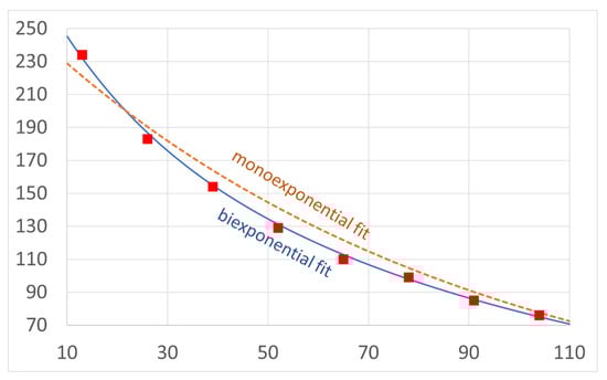 Comparison of mono- (dashed line) and bicomponent (solid line) fitting curves for eight exemplary echo time points (squares) showing a higher error for the monoexponential fit.