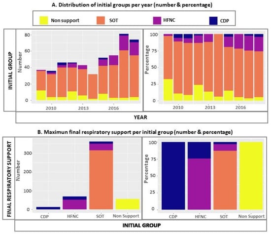 The global and per year distribution of the groups on admission and their maximum respiratory support escalation is represented in Figure 2. The most commonly available and more frequently used modality of respiratory support was SOT. There were no cases of respiratory modality support escalation for stabilised patients without the need for oxygen.