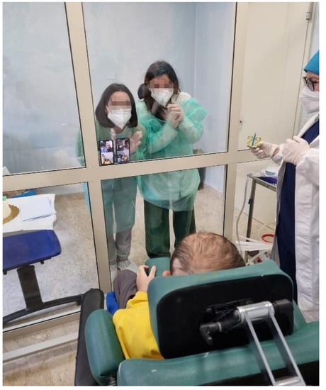 The experimental training consisted of multidisciplinary meetings, in which the patients and the caregivers were separated by a glass cabin (namely, FGC) to allow for a safe interaction (see Figure 1).