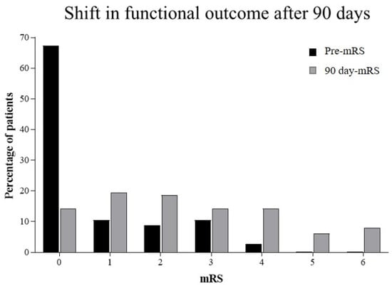Shift in functional outcome after 90 days: premorbid modified Rankin scale (Pre-mRS; n = 113), modified Rankin Scale on day 90 (90 d-mRS; n = 107).