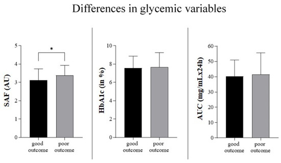 Patients with a poor versus good outcome did not differ in admission glucose, in glycemic AUC, or in HbA1c. However, patients with a poor outcome showed higher SAF (mean 3.13 (SD 0.61) vs. mean 3.38 (SD 0.55), p = 0.023) (see Figure 2).