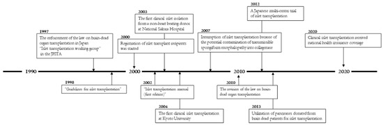 Transplantation medicine, which is established by receiving the donations of organs and tissues from patients after brain death or after cardiac death, is greatly influenced by the ethics that define death, legislation, and the social systems of each country. In Japan, a long-standing debate on the definition of brain death was held, and in 1997, a law on organ transplantation from brain-dead donors was finally enacted, and brain-dead organ transplantation was started under this law []. However, the severe shortage of donors has continued to be a serious problem, and many organ transplants from living donors were performed, including lung [], liver [], kidney [], and pancreas transplantation [].