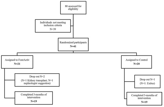 From March 2019 to July 2020, 80 potential consecutive candidates from the Nephrology and Renal Transplant Department at the Center de Dialisi I Recerca Aplicada (DIRAC) and the Hospital Clinic de Barcelona were screened. However, 39 of these patients did not meet the inclusion criteria. The remaining 41 patients were randomized into the intervention and control (usual care) groups. Three patients withdrew from the study before the three-month endpoint (one due to death, one due to transplantation, and one at the request of a nephrologist). Thus, 38 subjects completed the study, with 19 in the intervention group and 19 in the control group.