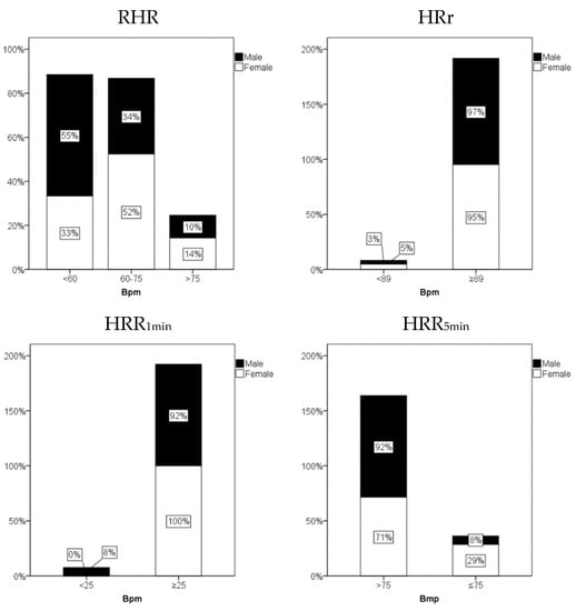 Moreover, abnormal HRR after submaximal exercise (≤42 bpm, 2 min later) is associated, among other factors, with high RHR (≥90 beats/min), high resting systolic blood pressure (≥140 mm Hg), high BMI, low PA levels, and impaired chronotropic response [22]. Regarding the data obtained in our study, we observed that 100% of our participants achieved an HRR > 12 bpm at 1 min and >44 bpm at 5 min, which indicates a healthy HRR after maximal exercise [56]. Likewise, most athletes displayed an HRR1min ≥ 25 bpm [57], and an HRR5min > 75, which is a threshold level for risk of death from any cause.