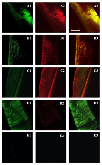 Confocal laser scanning microscopy of Enterococcus faecalis-infected dentinal tubules after different irrigation protocols and viability staining. Two-dimensional images of the green channel (A1–D1); two-dimensional images of the red channel (A2–D2); two-dimensional images of the composite reconstruction (A3–D3). NDs-BAK group (nanodroplets with Benzalkonium Chloride) (A1–A3). CHX group (chlorhexidine) (B1–B3). NaOCl group (sodium hypochlorite) (C1–C3). Positive controls (D1–D3) and negative controls (E1–E3). The pulpal side is represented on the left side for each image and the scale length is 300 μm.