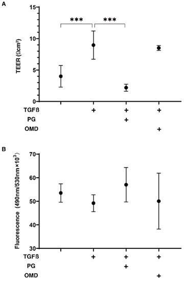 Effects of PGF2α and the EP2 agonist, omidenepag (OMD), on barrier functions of TGFβ2-treated 2D HTM monolayers by transendothelial electrical resistance (TEER) (A) and FITC-dextran permeability (B). To compare the effects of 100 nM PGF2α (PG) and omidenepag (OMD) on the barrier functions of 5 ng/mL TGF-β2 (TGFβ)-treated 2D HTM monolayers, TEER values (Ωcm2) and FITC-dextran permeability were measured in addition to the TGFβ untreated control, and these values were plotted in panel A and B, respectively. “+” is reagents addition. All experiments were performed using fresh preparations (n = 3–4). All data are presented as the arithmetic mean ± standard error of the mean (SEM). *** p < 0.005 (ANOVA followed by a Tukey’s multiple comparison test).