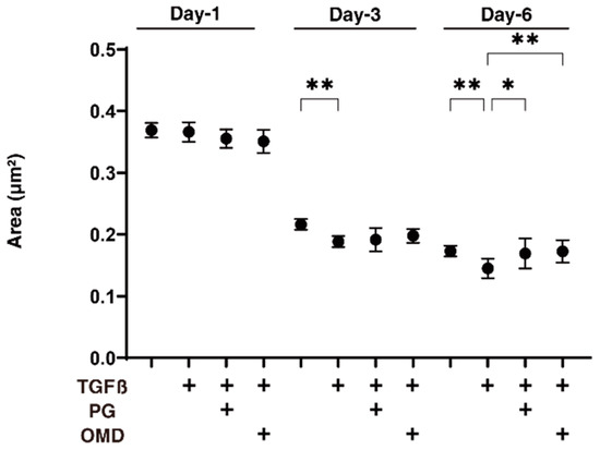 Effects of PGF2α and the EP2 agonist, omidenepag (OMD), on sizes of TGFβ2-treated 3D HTM spheroids at days 1, 3, or 6.To compare the effects of 100 nM PGF2α (PG) and omidenepag (OMD) on the mean sizes of the 5 ng/mL TGF-β2 (TGFβ) HTM 3D spheroids, measurements were made on days 1, 3, or 6 in addition to TGFβ untreated controls, and plotted (n = 10–12 3D spheroids for each experimental condition). “+” is reagents addition. Data that are presented are the arithmetic mean ± standard error of the mean (SEM), and statistical differences were determined by ANOVA followed by a Tukey’s multiple comparison test. * p < 0.05, ** p < 0.01.