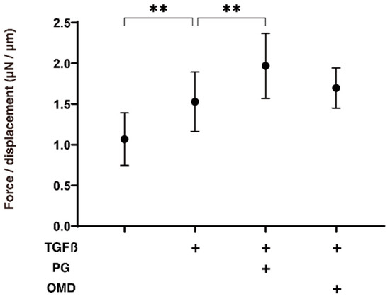 Effects of PGF2α and the EP2 agonist, omidenepag (OMD), on stiffness of TGFβ2-treated 3D HTM spheroids.To compare the effects of 100 nM PGF2α (PG) and omidenepag (OMD) on the stiffness of the 5 ng/mL TGF-β2 (TGFβ) HTM 3D spheroids, those at day 6 were subjected to a micro-squeezer analysis in addition to TGFβ untreated controls. The required force (μN) was measured and force/displacement (μN/μm) were plotted (n = 10–12 3D spheroids in each experimental condition). “+” is reagents addition. Data presented are the arithmetic mean ± standard error of the mean (SEM), and statistical differences were determined by ANOVA followed by a Tukey’s multiple comparison test. ** p < 0.01.