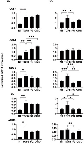 At day 6, HTM 2D cells and 3D spheroids (NT: non-treated control) and those treated with a 5 ng/mL solution of TGF-β2 (TGFβ) in the absence and presence of 100 nM PGF2α (PG) or the EP2 agonist, omidenepag (OMD), were subjected to qPCR analysis to estimate the expression of mRNA in ECMs (COL1, COL4, COL6, FN, and αSMA). Analyses were performed in triplicate using fresh preparations (n = 12–15 3D spheroids each). Data presented are the arithmetic mean ± standard error of the mean (SEM), and statistical differences were determined by ANOVA followed by a Tukey’s multiple comparison test. * p < 0.05, ** p < 0.01, *** p < 0.005.