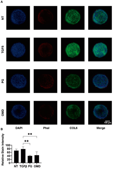 At day 6, 3D spheroids (NT: non-treated control) and those treated with a 5 ng/mL solution of TGF-β2 (TGFβ) in the absence and presence of 100 nM PGF2α (PG) or the EP2 agonist, omidenepag (OMD), were immunostained with specific antibodies against COL6 (green), DAPI (blue), and phalloidin (Phal, red). Representative immunolabeling by anti-COL6 is shown in panel A (Scale bar: 100 µm) and the intensities of staining are plotted in panel B. All experiments were performed in duplicate using fresh preparations consisting of 10 spheroids each. Data presented (total n = 20 different 3D spheroids’ images) are the arithmetic mean ± standard error of the mean (SEM), and statistical differences were determined by ANOVA followed by a Tukey’s multiple comparison test. ** p < 0.01.