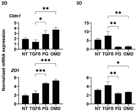 To examine this issue further, qPCR analyses of tight junction (TJ)-related proteins in TM, claudin11 (Cldn11) and ZO1 [28,29], ECM regulatory factors; TIMP1-4, MMP2, 9 and 14, and CTGF, and ER stress-related factors; the glucose regulator protein (GRP)78, GRP94, the X-box binding protein-1 (XBP1), spliced XBP1 (sXBP1) and the CCAAT/enhancer-binding protein homologous protein (CHOP) were performed. TJ-related molecules and the mRNA expression of Cldn11 and ZO1 were significantly up-regulated (2D) or down-regulated (3D) by the presence of PGF2a or OMD although the values were not affected by TGF-β2 (Figure 6). While in contrast, TIMP2 (2D), TIMP3 and 4 (3D), MMP2, 9 and MMP14 (2D and 3D), CTGF (2D and 3D), and all five ER stress-related genes except GRP78 (2D) or GRP94, XBP, and sXBP (3D) were significantly up-regulated or down-regulated, respectively, upon the administration of a 5 ng/mL solution of TGF-β2 (Supplemental Figures S3–S5). The addition of PGF2α or OMD induced a significant down-regulation of TIMP1 (2D and 3D), TIMP3 (3D), MMP14 (3D), GRP 78 (2D), GRP 94 (2D), XBP (2D), sXBP (2D), and CHOP (2D and 3D) and an up-regulation of CTGF (2D) and a down-regulation of TIMP3 (3D) as well as all five ER stress-related genes (2D), and an up-regulation of CTGF (2D), respectively (Supplemental Figures S3–S5). The above observations are summarized in Table 1; (1) TGF-β2 induced a significant up-regulation of most of the ECM proteins, ECM regulatory factors, TIMPs and MMPs, and CTGF in both 2D- and 3D-cultured HTM cells, but the expression of ER stress-related was different between the 2D- (up-regulated) and the 3D (down-regulated)-cultured HTM cells, and (2) PGF2α and OMD had similar effects on the expressions of COL4 (2D), COL6 and FN (3D), TJ-related molecules (2D; up-regulation, 3D; down-regulation), TIMP3 (3D; up-regulation), CTGF (2D; up-regulation) and most of the ER stress-related factors, but some gene expressions including for COL1 and αSMA (3D), TIMP1 (2D and 3D), MMP9 (3D), and CHOP (3D) were different between two drugs. Therefore, these collective findings suggest that the PGF2α and OMD induced the up-regulation of TJ-related molecules (2D) and their diverse effects on the expression of several genes may cause diverse effects toward the barrier functions of the 2D HTM monolayers as well as the physical properties of the 3D HTM spheroids, as described above.