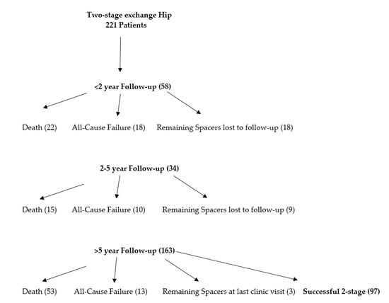 - Petis, S.M.; Abdel, M.P.; Perry, K.I.; Mabry, T.M.; Hanssen, A.D.; Berry, D.J. Long-Term Results of a 2-Stage Exchange Protocol for Periprosthetic Joint Infection Following Total Hip Arthroplasty in 164 Hips. J. Bone Jt. Surg. Am. 2019, 101, 74–84. [Google Scholar] [CrossRef] [PubMed]